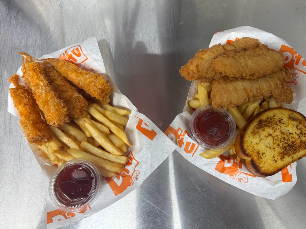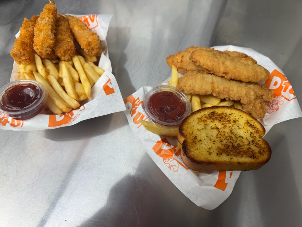 10 chicken tenders, papas doradas, 4 panes y 4 salsas.